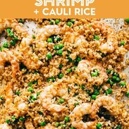 - Arrange shrimp and peas on top of cauliflower rice. Sprinkle shrimp with salt, pepper, garlic powder, and brush with butter. Bake for another 5-7 minutes.